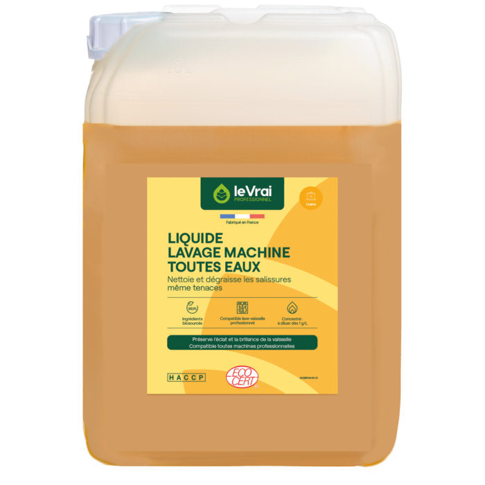 Formule certifiée Ecocert conçue pour les équipements professionnels. Convient à tous types de vaisselle - Élimine amidon, protéines, thé, café, rouge à lèvres…Ne laisse pas de traces - Efficace en eaux douces à très dures.