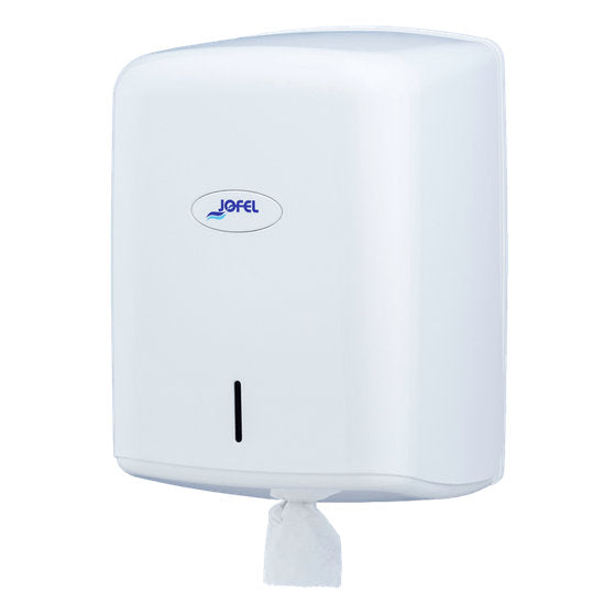 Distributeur box de papier bobine/mèche - Panneau avant entièrement rabattable pour faciliter la recharge du papier et serrure avec clef - Nécessite une bobine spéciale, soutenue sur le côté et sans mandrin pour distribuer par le centre de la base - Capacité pour des bobines d’un ø maximal de 205 mm.