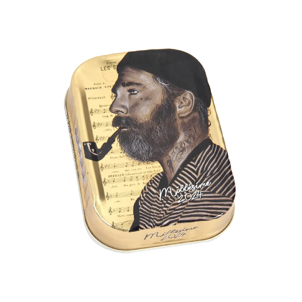 Les sardines millésimes 2024 sont un hommage au centenaire de la grève des sardinières en 1924. Cette illustration de Flore Betty, artiste peintre installée à Douarnenez, est une représentation d'un marin pêcheur de sardines, sur fond d'une partition d'un chant d'époque.