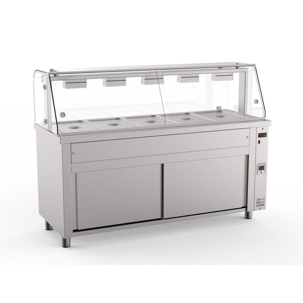 Pour 5 bacs GN 1/1 hauteur 150 mm (non fournis) - 3,25 kW - 230 V mono - Extérieur et intérieur en acier inoxydable AISI 304 de haute qualité. Fonctionnement en mode humide. Contrôleur numérique avec affichage de la température. Alarme de faible niveau d'eau pour protéger. Équipé d'une lampe halogène par emplacement. Vitrine en verre trempé avec portes coulissantes à l’arrière. Portes doubles coulissantes de conception ergonomique, à double paroi, isolation polyuréthane. Pieds réglables en hauteur.
