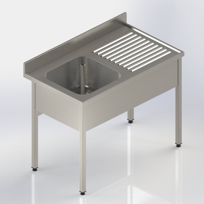 Plonge adossée 12/10ème avec égoutoir à gaiuche - Inox AISI 304. Bac embouti hauteur 300 mm. Egouttoir nervuré. Dosseret arrière 100x20mm. Bandeaux cache bacs de 300 mm sur 3 cotés. Réservation à l’arrière de 80 mm pour passage évacuation. Piètement inox tube 40x40 mm. Ensemble entièrement soudé. Equipé de vérins de réglage. Livrée avec siphon, bonde et tube surverse.