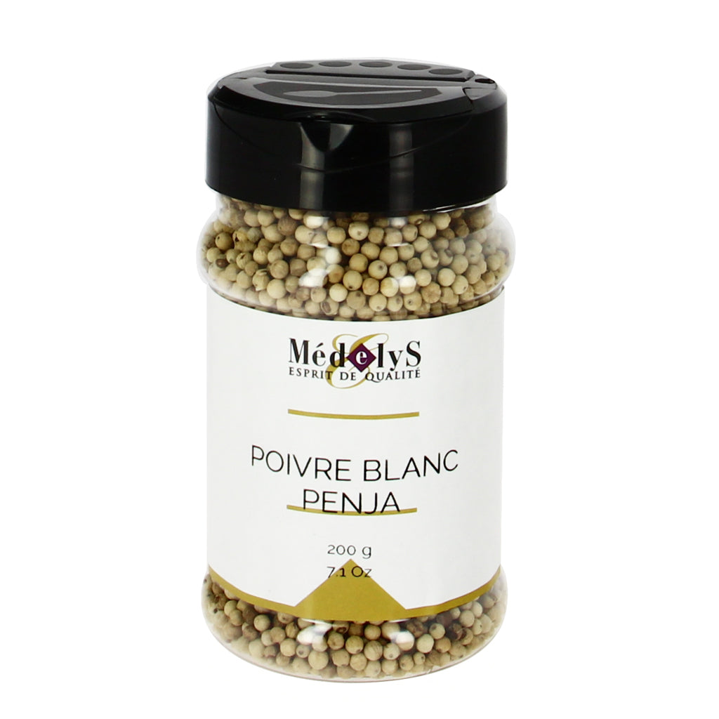 Ce poivre implanté à Penja, au Cameroun, est caractérisé d’une part, par son terroir volcanique naturellement riche et équilibré, et d’autre part, par la précieuse eau de source indispensable à la production de ce poivre blanc. A l’aération, le nez exprime de fortes notes de menthol et de vétiver, dans un ensemble plutôt herbacé. Dès l’attaque, le poivre blanc Penja présente une saveur chaude et piquante, marquée par des arômes sucrés de viande caramélisée, par la suite dominés par des notes de musquées et douces qu’enveloppent des flaveurs d’encens.