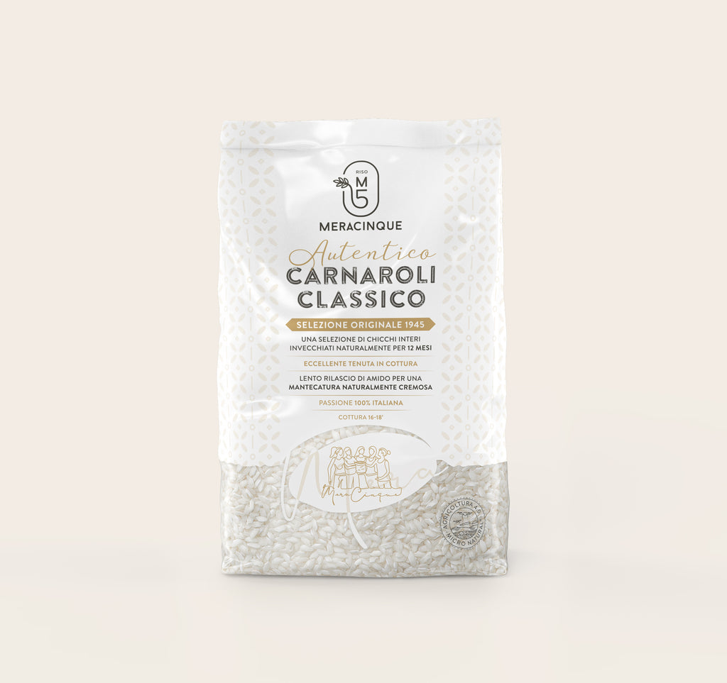 Meracinque cultive uniquement des graines 100% Carnaroli en pureté, c’est pourquoi il est certifié comme Carnaroli Classico